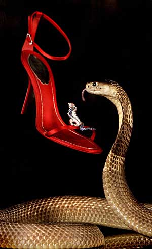 英國哈羅德百貨公司日前發(fā)布新款鞋時,為防止價格昂貴的鞋遭竊,竟想出奇招,“雇傭”一條眼鏡蛇為“保鏢”。毒蛇與精致鞋子的搭配,自然成為一大亮點。