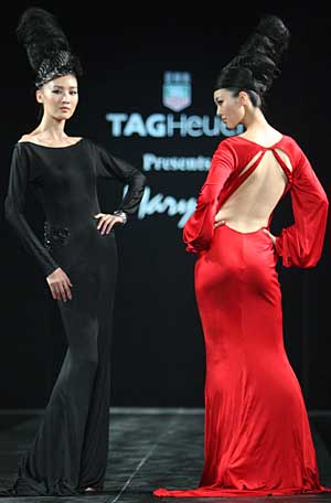 圖為模特在北京明城墻遺址公園展示馬艷麗專為豪雅表時尚盛宴設(shè)計的時裝。