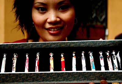 26歲的天津市民李月晴從小就練習(xí)在粉筆上雕刻,至今已制作完成中國(guó)古代四大美女、紅樓夢(mèng)人物、卡通人物等多組粉筆雕刻作品。圖為李月晴展示自己制作的粉筆雕刻作品。