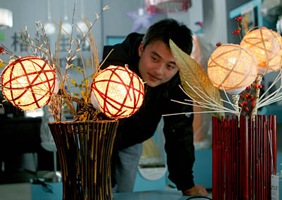 在安徽省淮北市一商店,一位市民在觀看用藤條制作的鏤空裝飾燈。這種藤條制作的燈既環(huán)保又時(shí)尚,頗受消費(fèi)者青睞。
