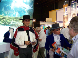 第12屆拉丁美洲國際旅游展17日在阿根廷首都布宜諾斯艾利斯拉魯拉爾展覽中心拉開帷幕。來自拉美以及加勒比50多個(gè)國家和地區(qū)的1800個(gè)旅游機(jī)構(gòu)、企業(yè)參加了此次展會。圖為智利“奎卡”舞演員正向參觀者分發(fā)資料。