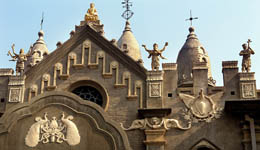 武漢古德寺,是國內(nèi)漢傳佛教中惟一一座仿緬式佛教寺院,始建于清光緒三年(1887年)。寺院迥異于中國傳統(tǒng)佛教寺廟樣式,仿緬甸阿難陀寺院風(fēng)格,分別借鑒了南傳佛教“帕那瓦”式的群塔叢林和古希臘神廟的柱廊特征,并融入了哥特式建筑風(fēng)格。這座融匯大乘、小乘和藏密三大佛教流派于一身,并具有多元化建筑風(fēng)格的寺廟,是武漢百年前即向世界開放的有力證據(jù),具有非常獨(dú)特的建筑觀賞價(jià)值、旅游價(jià)值與文物保護(hù)價(jià)值。圖為古德寺圓通寶殿頂部的造像和圖案,具有鮮明的異域佛教寺院風(fēng)格。 |