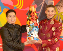 奧運(yùn)吉祥物“福娃”主創(chuàng)人員陳楠(左)向主辦方代表遞交以“福娃”為題材而創(chuàng)作的藝術(shù)瓶。新華社記者:陳建力 攝