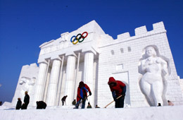 2008中國沈陽國際冰雪節(jié)大型雪雕“雅典—北京”、“龍騰奧運”等亮相沈陽棋盤山冰雪大世界。本屆冰雪節(jié)用雪量達50萬立方米,以“冰雪奧運”的主題吸引游客。冰雪節(jié)將于1月11日在沈陽棋盤山開幕。圖為工作人員修整大型雪雕“雅典—北京”。