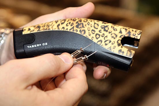在剛剛結(jié)束的國(guó)際消費(fèi)電子展上亮相的一款時(shí)尚防身槍——新款泰瑟槍,或許能夠滿足時(shí)尚女性的需求。 這款泰瑟槍的首要功能是防衛(wèi),能發(fā)射5萬伏特的高壓電脈沖。被擊中者神經(jīng)和肌肉系統(tǒng)暫時(shí)癱瘓,失去行動(dòng)能力。其不凡之處在于它內(nèi)置有一臺(tái)mp3音樂播放器,存儲(chǔ)器容量1G。新華社/法新 | |