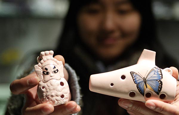 春節(jié)臨近,一些新穎別致的個(gè)性化陶瓷工藝品在京城亮相,受到許多年輕人的青睞。圖為北京一名女孩展示分別畫有京劇臉譜和蝴蝶圖形的陶瓷哨子。