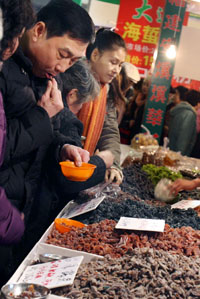 1月21日,市民們?cè)谡古_(tái)前品嘗果脯。當(dāng)日,在上海光大會(huì)展中心開(kāi)幕的“2008年中國(guó)(上海)食品博覽會(huì)”上,來(lái)自全國(guó)各地的食品、農(nóng)副產(chǎn)品、糖酒和調(diào)味品等數(shù)百種土特產(chǎn)一齊亮相,眾多上海市民前來(lái)參觀并選購(gòu),為即將來(lái)臨的新春佳節(jié)置辦年貨。