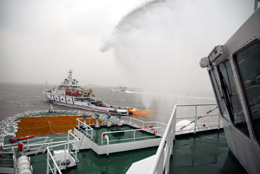 1月23日,“南海救101”輪在救助演習(xí)中動(dòng)用消防水炮,直射假想中的難船。