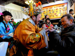2月14日,是農(nóng)歷初八,山西平遙古城在春節(jié)期間推出“縣太爺拜年”、“財神爺賜!钡忍厣糜伪硌,讓游客在欣賞平遙古城的同時,體驗晉商故里的濃情民俗,感受年文化的魅力,受到游客的歡迎。