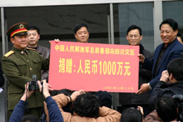20日,解放軍總裝備部政治部副主任郝建昌少將把1000萬元捐款交至四川省副省長張作哈手中。