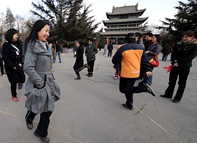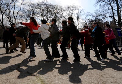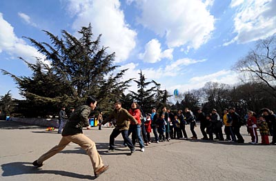 太原市20多位市民日前帶著孩子來(lái)到迎澤公園,重溫兒時(shí)和小伙伴們一起玩耍的情景,老鷹捉小雞、跳皮筋、丟沙包等游戲讓這些成年人似乎重新回到了童年。
