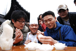 近日,揚(yáng)州大學(xué)旅游烹飪學(xué)院“迎人文奧運(yùn) 展揚(yáng)州民俗”活動在荷花池公園舉行。該院的學(xué)生們展示了剪紙、面塑、食品雕刻等技藝,制作出了許多精美的作品,贈送給在場的市民,喜迎北京奧運(yùn)會。