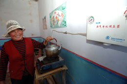 近年來,位于青海省柴達(dá)木盆地的海西蒙古族藏族自治州農(nóng)業(yè)部門在戈壁農(nóng)村庭院內(nèi)積極推廣修建日光溫室、豬禽舍、廁所、沼氣池,發(fā)展“四位一體”相結(jié)合的新能源生態(tài)庭院,并根據(jù)有關(guān)規(guī)定按照各地實際情況免費發(fā)放沼氣設(shè)施配套設(shè)備,讓農(nóng)民告別了煙熏火燎的日子。圖為都蘭縣興盛村一位農(nóng)民在利用沼氣燒水。