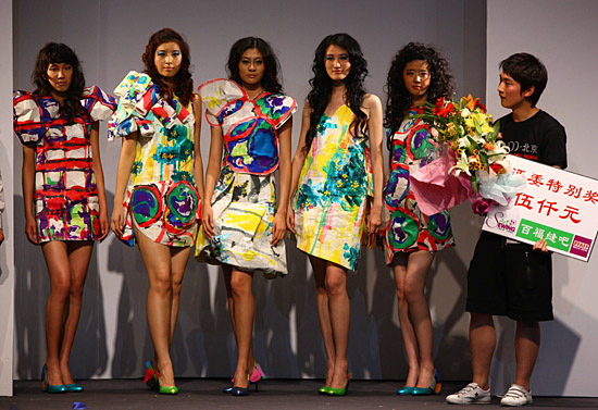 日前,ESMOD·北京高級時裝設(shè)計學院2008年學生畢業(yè)作品展演在北京舉行。圖為模特們在展示畢業(yè)生作品。