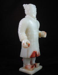 2008年10月,兩件海外回流文物將由北京中嘉國際拍賣公司公開拍賣,一件是戰(zhàn)國和田玉武士俑,另一件是戰(zhàn)國和田玉劍。 在傳世古玉器中,用新疆和田籽玉琢制而成的藝術品尤其珍貴。將要拍賣的戰(zhàn)國秦武士俑高23厘米,選用上等和田籽玉,玉質如羊脂般潔白細膩。俑身下部帶有朱砂紅泌、衣甲邊延有非常珍貴的只有和田籽玉才有的棗皮紅。人物莊重、肅穆的表情,體現了武士的威嚴和恭敬,且形象生動,服飾衣甲、發(fā)式均真實具體,人物臉部輪廓及紋飾線條極為流暢自然,傳神、生動,極具藝術魅力,體現了戰(zhàn)國時代琢玉藝人高超的工藝和非凡的藝術想象力。 另一件戰(zhàn)國和田玉劍為新疆和田籽料琢制,長49.8厘米,由劍首、劍莖、劍格、劍身所組成,劍首為扁圓餅狀,帶有少量朱砂紅泌,裝飾紋分為內外兩部分,外部為一圈柿蒂紋圍繞,內部為隆起的一朵菱花紋,線條流暢而有動感,莖部為螺旋紋,工藝要求精度極高,劍格浮雕饕餮紋,紋飾精美,是典型戰(zhàn)國中、晚期風格,為戰(zhàn)國時楚國的形制。其工藝之精巧,劍形之美,紋飾之細膩,用料之考究。 北京市文物局副研究員、鑒定專家史潤梅認為,這兩件戰(zhàn)國玉器,用料為新疆和田籽玉,溫潤潔白,如羊脂,工藝水平非常高超,用現代工具都達不到,玉俑面部輪廓細膩、發(fā)絲清晰,衣紋鎧甲,飄逸整齊。玉劍形式規(guī)整,做工精致。為難得一見的精品玉器。 |