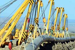 8臺吊管機正在將直徑1.2米的天然氣管道緩緩沉入3米多深的管溝中。在新疆博樂境內(nèi)的天山腳下,國家重點建設(shè)工程西氣東輸二線的建設(shè)者們正頭頂烈日緊張施工。西氣東輸二線工程于2008年2月22日開工建設(shè),全長9139公里,途經(jīng)我國14個省區(qū)市。年輸氣量300億立方米,穩(wěn)定供氣30年以上,是我國首次引進境外天然氣資源、具有戰(zhàn)略意義的特大型天然氣管道建設(shè)項目。