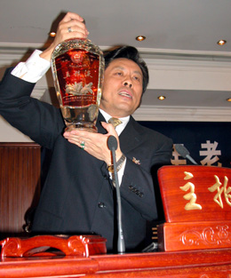 2004年7月一瓶釀?dòng)?00年前的五糧液以50萬(wàn)元被拍賣(mài)。新華社記者:周俏春 攝