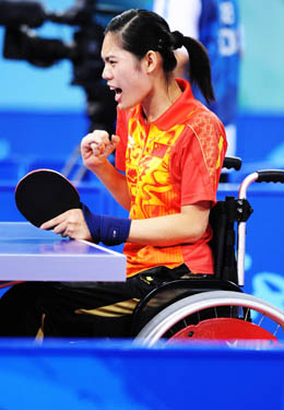 9月10日,中國選手劉靜在比賽中慶祝得分。當(dāng)日,在北京2008年殘奧會乒乓球女子單打F1-2決賽中,劉靜以3比1戰(zhàn)勝意大利選手帕梅拉·佩祖托,奪得冠軍。