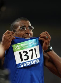 9月10日,古巴選手加拉諾在比賽后。當(dāng)日,在國家體育場進行的北京2008年殘奧會男子400米T13級決賽中,加拉諾以49秒12的成績奪冠。