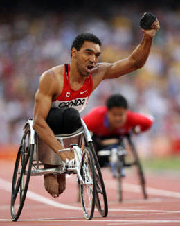 9月10日,加拿大選手伯杰龍在沖過終點后慶祝。當(dāng)日,在北京2008年殘奧會男子200米T52級決賽中,伯杰龍以30秒81的成績奪冠。