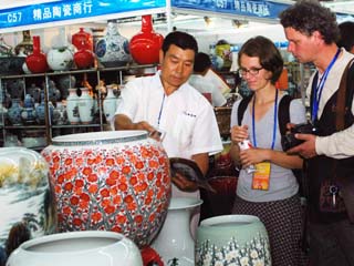9月16日,在淄博舉行的國際陶瓷博覽會上,兩名外國參觀者與一名參展商洽談。