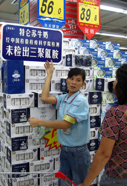9月24日,在?谀吵校膳ED掏瞥鰞(yōu)惠活動(dòng),并標(biāo)出牛奶不含三聚氰胺的標(biāo)志。目前,蒙牛、伊利等奶制品商家都在?谑懈鞔蟪匈N出公告,承諾目前所售產(chǎn)品已通過(guò)檢驗(yàn),市民可放心飲用。鑒于消費(fèi)者對(duì)商品的信心還有待恢復(fù),部分商家積極開(kāi)展了各類(lèi)促銷(xiāo)活動(dòng)。 |