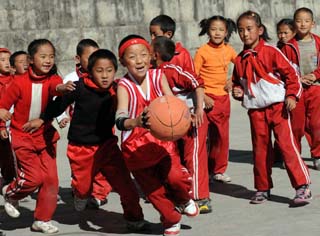 云南省迪慶藏族自治州德欽縣地處云南和西藏的交界地帶,海拔3400多米。近年來當(dāng)?shù)氐拿褡褰逃聵I(yè)蓬勃發(fā)展,藏族孩子的入學(xué)率達(dá)到99%以上,切實(shí)保障了適齡兒童受教育的權(quán)利。從2007年起,德欽縣還實(shí)施了“藏區(qū)高原農(nóng)牧民子女學(xué)生生活補(bǔ)助工程”,讓當(dāng)?shù)厣先f名農(nóng)牧民孩子受益。如今藏族孩子們坐在寬敞明亮的教室里接受現(xiàn)代文明的教育,一天天地茁壯成長。 云南省迪慶藏族自治州德欽縣示范小學(xué)的學(xué)生正在打籃球。 |