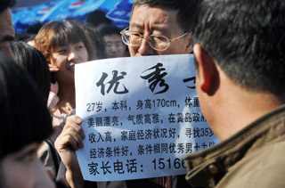 10月26日,青島市半島之戀相親會(huì)舉行,報(bào)名的2200余位單身青年親自到場(chǎng)不足一半,會(huì)場(chǎng)上更多的是忙著張羅的家長(zhǎng)的身影。不少家長(zhǎng)坦言,他們是瞞著子女來(lái)為其征婚的,擇偶條件也很實(shí)際,收入、房子、工作、長(zhǎng)相等條件都要心中有數(shù)。圖為一名父親正在相親會(huì)上為女兒征婚。 |