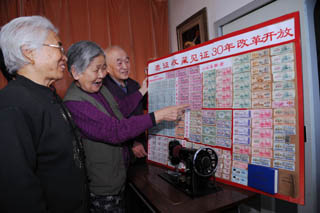 董化銘老人指著展板上的各類票證回憶起往事:“在那個年代,不僅人們收入微薄,而且物資匱乏,一切東西全部都要憑票證,實行計劃供應(yīng)。” 各類票證充斥著人們的生活,糧票、肉票、布票、鹽票、油票、煙票、……就連買糖果、糕點、火柴、肥皂也要憑票,票證漸漸成了城鄉(xiāng)居民吃飽穿暖的一種保障。一個家庭所有生活必需品都離不開各種票證,在當時誰家要是把票證丟失了,就意味著這個月可能沒有肉吃沒有衣穿了。 一個好的當家人不僅要計算著每月幾十元工資如何養(yǎng)活一家數(shù)口人,還要精打細算精心管理如何使用一個月內(nèi)各種票證,每人每月供應(yīng)三兩油,根本就不夠吃,每日飯菜很少吃到油香味,所以家里買肉時都挑肥的。當年的米面約0.15元一斤,豬肉約0.74元一斤,都得憑票購買,那時候的人們都是‘等米下鍋’,只等票兒一到手,迫不及待就要去買米,沒有票,人們拿錢也買不到這些東西。老人說,家里至今仍保存著的一臺燕牌縫紉機就是憑當年的票證買的。 董化銘老人還告訴記者:“之所以現(xiàn)在還能留下這么多糧票,并不是因為當年家里富余吃不完,而是因為過去糧食少,經(jīng)常有票也買不上,所以這些糧票才會剩在手里!