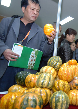11月5日在陜西楊凌開幕的第十五屆中國楊凌農(nóng)業(yè)高新科技成果博覽會上,新竹市青果商業(yè)同業(yè)公會首次前來參展,帶來了10種產(chǎn)自臺灣的特色水果進行展銷。圖為參觀者在新竹市青果商業(yè)同業(yè)公會展臺前觀看產(chǎn)自臺灣的特色南瓜。