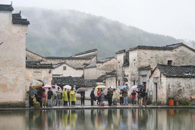 在長(zhǎng)江下游的皖南山區(qū),散布著許多數(shù)百年來(lái)風(fēng)貌依舊的古村落,而位于安徽黟縣境內(nèi)的西遞和宏村最負(fù)盛名,被譽(yù)為“中國(guó)畫里鄉(xiāng)村”。改革開放初期,西遞和宏村開始利用其獨(dú)具魅力的徽州文化和獨(dú)特的自然景觀發(fā)展旅游經(jīng)濟(jì),走出了一條依托旅游經(jīng)濟(jì)來(lái)保護(hù)和傳承徽州文化遺產(chǎn)的發(fā)展道路。 圖為游人在雨霧中游覽宏村月沼。 |