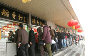 每逢元宵、端午和中秋,許多老北京都講究到稻香村買(mǎi)上點(diǎn)兒元宵、粽子或月餅,而稻香村門(mén)店前蜿蜒排起的長(zhǎng)龍也是京城節(jié)日一景。雖然是北京的百年老號(hào),稻香村主營(yíng)的卻是南味食品,而且在競(jìng)爭(zhēng)激烈的京城食界“百年不老”,個(gè)中緣由頗耐人尋味。