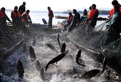 河南信陽(yáng)南灣水庫(kù)生態(tài)魚冬季捕撈日前開始,第一網(wǎng)就捕撈了兩萬(wàn)多斤鰱魚。南灣水庫(kù)可養(yǎng)殖水面有7萬(wàn)畝,每年投入魚苗20萬(wàn)公斤,采用人工放養(yǎng)和生態(tài)喂養(yǎng)的辦法,年捕撈魚類180萬(wàn)斤,另有60萬(wàn)斤魚苗供水庫(kù)內(nèi)各種鳥類捕吃,以維護(hù)生態(tài)平衡。