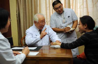 11月28日,北京醫(yī)院中醫(yī)科主任、90歲的著名老中醫(yī)李輔仁(左一)在為患者診病。據(jù)介紹,北京醫(yī)院中醫(yī)科涌現(xiàn)出新一批名中醫(yī)和中西醫(yī)結(jié)合專(zhuān)家,每年診治患者約10萬(wàn)人次。新華社記者:李曉果