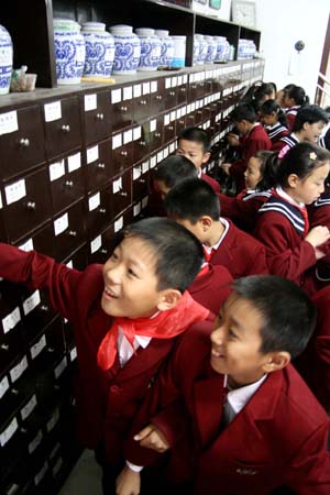 中醫(yī)學(xué)者建議在中小學(xué)教材中加入中醫(yī)藥常識(shí)專(zhuān)題,以加大中醫(yī)知識(shí)普及力度。圖為安徽小學(xué)生參觀中藥房。程千俊