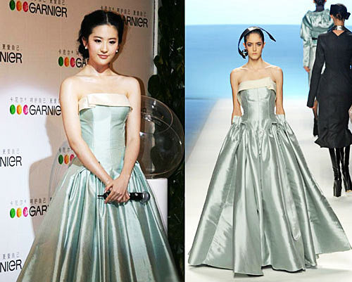 | 劉亦菲在參加某活動時穿著的禮服被指酷似某大牌禮服,故被網(wǎng)友戲稱為山寨禮服。(資料照片) |