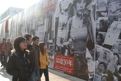 “長(zhǎng)安杯”紀(jì)念改革開放30周年全國攝影大展定于12月16日在北京王府井步行街舉行。圖為人們從大展活動(dòng)巨幅宣傳牌前走過。