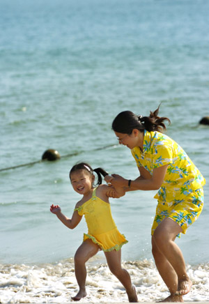 美麗的沙灘,燦爛的陽光,清新的空氣,25攝氏度的怡人氣溫使得海南省三亞市成為中國冬季最溫暖舒適的度假勝地之一。12月8日,一位游客帶著孩子在三亞市大東海海灘上嬉戲。本報記者:郭程 攝
