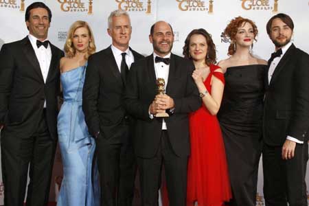 在第66屆美國電影電視金球獎頒獎典禮上,電視劇《廣告狂人》獲電視劇情類最佳系列劇獎。圖為該劇主創(chuàng)人員和主要演員合影。新華社/路透