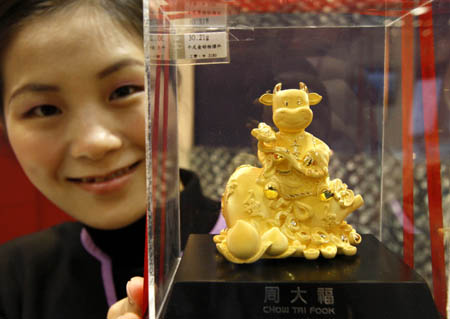 隨著農(nóng)歷牛年的臨近,各類牛黃金飾品紛紛面市。一款款栩栩如生、憨態(tài)可掬的“金!笔艿奖姸嘞M者的青睞。