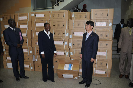 1月22日,中國駐塞內(nèi)加爾大使盧沙野(右)向塞內(nèi)加爾衛(wèi)生部部長蒂亞姆(Safiatou Thiam)在達喀爾轉(zhuǎn)交中國贈予塞內(nèi)加爾的抗瘧藥品。根據(jù)中塞兩國醫(yī)療合作協(xié)定,中國政府當天向塞內(nèi)加爾政府贈送第二批價值200萬元人民幣的抗瘧藥品。2007年4月,中國已向塞內(nèi)加爾贈送了同等價值的抗瘧藥品。