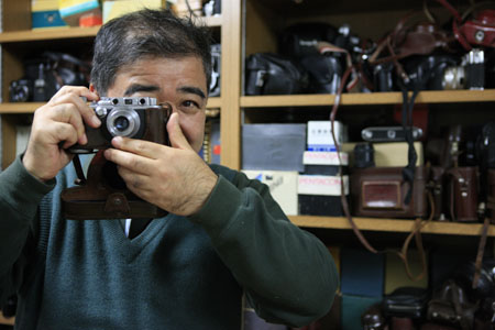 在位于東京偏北部的家中,河野手持其鐘愛的上海58相機。新華社記者:任正來