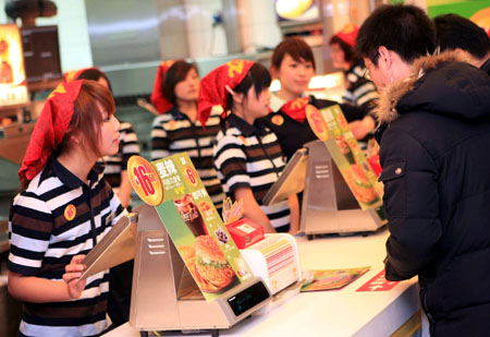 2月4日,麥當勞(中國)有限公司在上海宣布,將在全國范圍的餐廳推出16.5元“天天超值套餐”。據(jù)稱,該系列套餐的價格優(yōu)惠高達32.6%。此舉顯示洋快餐巨頭為刺激銷量增長,以“超值套餐”的促銷方式調(diào)低產(chǎn)品的實際售價。圖為顧客在上海一麥當勞餐廳內(nèi)購買食品。
