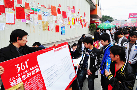 泉州晉江陳埭鎮(zhèn)溪邊烏橋頭招工現(xiàn)場(chǎng),外來(lái)工觀望者居多。2008年下半年以來(lái),民營(yíng)經(jīng)濟(jì)發(fā)展迅速的福建省泉州市經(jīng)受住金融危機(jī)沖擊,未出現(xiàn)大量企業(yè)倒閉、工人失業(yè)、農(nóng)民工提前返鄉(xiāng)現(xiàn)象,全市150多萬(wàn)外來(lái)工穩(wěn)定就業(yè)。熟練工人、普工、技術(shù)人員成為受企業(yè)青睞對(duì)象。