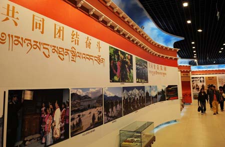 在云南省迪慶藏族自治州香格里拉縣,有一座在全國(guó)藏區(qū)獨(dú)具特色的紅軍長(zhǎng)征博物館。該博物館重現(xiàn)了1936年4、5月間中國(guó)工農(nóng)紅軍長(zhǎng)征途經(jīng)迪慶時(shí)的感人場(chǎng)景及70多年來雪域高原發(fā)生的巨大變化。目前該博物館已經(jīng)成為迪慶藏區(qū)的愛國(guó)主義和革命傳統(tǒng)教育基地,每年吸引近10萬名中外游客和當(dāng)?shù)厝罕娗皝韰⒂^,成為香格里拉旅游的新亮點(diǎn)。這是一些游客在云南省迪慶藏族自治州香格里拉縣的紅軍長(zhǎng)征博物館內(nèi)參觀。 |