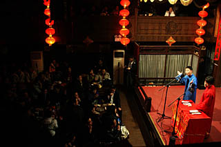 “嘻哈包袱鋪”的陣地駐扎在北京鼓樓大街廣茗閣茶樓,每周三、四、五的晚上和周六的下午,“嘻哈包袱鋪”都會(huì)在這里進(jìn)行相聲表演。 “我們的團(tuán)體是去年5月份成立并開始正式演出的,剛開始的幾個(gè)月,來聽我們相聲的人并不多,但是慢慢的,也許是大家口口相傳,來聽相聲的人越來越多!薄鞍や仭钡摹罢乒瘛保彩瞧鋭(chuàng)始人的高曉攀對(duì)記者說。目前,“嘻哈包袱鋪”已是京城最為火暴的相聲表演團(tuán)體之一,極富時(shí)代感的表演特色、每張20元的低票價(jià)(相聲劇30元),使最多能裝下220人的廣茗閣茶樓幾乎場場爆滿。 2月12日對(duì)于“嘻哈包袱鋪”的演員們來說是個(gè)極為普通的演出日。接近傍晚時(shí)分,天空下起了中雨,但廣茗閣不論樓上樓下依然坐滿了人!拔沂菑木W(wǎng)絡(luò)上聽說這個(gè)團(tuán)體的,上周五下午特意趕來買票,沒想到來的時(shí)候售票處已經(jīng)排了挺長的隊(duì),這周茶座的票都賣光了,我排了半天也只買到了加座。”和朋友特意趕來觀看相聲的陳小姐對(duì)記者說,“這還是我第一次進(jìn)茶館看相聲呢,以前都是在電視上看的。” “我和女朋友兩個(gè)人也是從朋友那兒知道這個(gè)‘嘻哈包袱鋪’的,上周來買票沒買到,看到今天下雨,心想沒準(zhǔn)有人來不了退票,就在門口等,沒想到還真讓我等到了兩張,真幸運(yùn)!瘪R先生略帶興奮地說。 記者觀察到,來聽嘻哈相聲的多是年輕人,不僅有“80后”,更有“90后”,“來聽我們相聲的年輕人居多,還有一部分是家長帶著孩子來的,從他們的反應(yīng)來看,他們也非常喜歡和理解我們這種說相聲的方式!备邥耘收f。 記者注意到,也有一些年紀(jì)稍大些的觀眾來給“80后”相聲捧場,他們多半是傳統(tǒng)相聲的忠實(shí)擁躉。齊先生就是其中一位,“我特別喜歡聽相聲,郭德綱沒火的時(shí)候我就在德云社聽,聽朋友說這個(gè)也挺有意思,就來看看。”