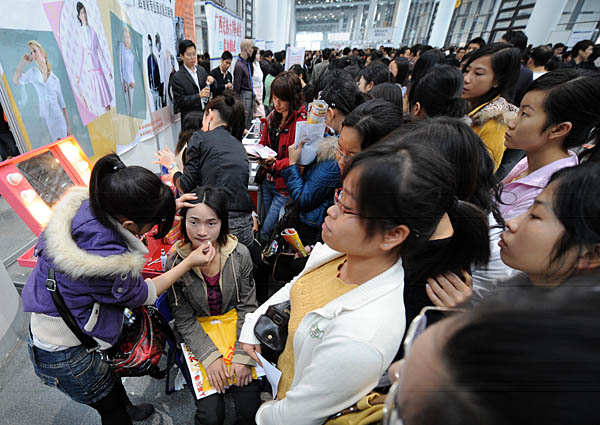 近日,“2009年春季廣西人才交流大會”在南寧市國際會展中心舉行,求職者除了要準備好各種材料,也越來越重視個人形象。一些形象設計、服裝租賃、人才評價公司亮相人才交流會,受到眾多求職者的追捧。圖為在廣西南寧市國際會展中心,一名求職者在體驗免費形象設計。