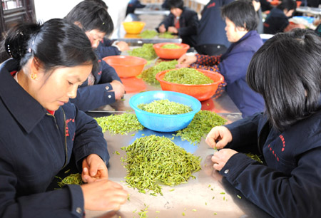 日,茶葉專業(yè)合作社的職工在分揀新摘的茶葉。 當(dāng)日,享譽(yù)海內(nèi)外的蘇州洞庭碧螺春茶在太湖洞庭東、西山開始陸續(xù)采摘。據(jù)專家介紹,隨著近期氣溫上升,一周后蘇州洞庭碧螺春茶將大批量應(yīng)市,預(yù)計(jì)今年蘇州洞庭碧螺春茶產(chǎn)量為140多噸。洞庭碧螺春種植于太湖洞庭洞西山的果園之中,茶樹常年受太湖霧氣滋潤(rùn),并包吸四季花果之香,炒制的茶葉具有“條索纖細(xì),卷曲成螺,茸毛遍體,銀綠隱翠”之外形和“湯色碧綠、入口爽甜、回味無窮”之內(nèi)質(zhì),制作500克特級(jí)洞庭(山)碧螺春茶約需一芽一葉的嫩芽6萬個(gè)左右。 |
