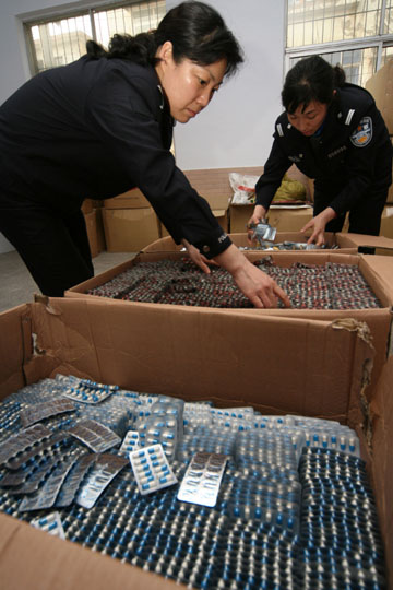 3月18日,河南省許昌市公安局魏都分局民警在涉嫌制造假藥的窩點(diǎn)統(tǒng)計查獲的假藥、標(biāo)簽、藥盒等。 當(dāng)日,魏都警方接群眾舉報,在市區(qū)向陽路一閑置廠房內(nèi)查獲一涉嫌制造假藥窩點(diǎn),當(dāng)場查扣涉嫌假冒藥品10多種,半成品藥品、包裝箱、合格證、防偽標(biāo)識等1000多件,涉案金額達(dá)2000余萬元。據(jù)介紹,這些假藥用肉眼難以分辨,必須借助先進(jìn)儀器檢測。此案目前正在進(jìn)一步調(diào)查中。 |