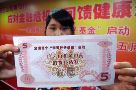 一名工作人員在?谑姓故景自粕胶忘S中藥有限公司派發(fā)藥品消費(fèi)券。從3月13日起,廣州白云山和黃中藥有限公司在全國(guó)范圍內(nèi)發(fā)放600萬(wàn)張總計(jì)3000萬(wàn)元的藥品消費(fèi)券。消費(fèi)者除了像往年一樣用舊藥換新藥外,另外還可以免費(fèi)領(lǐng)取藥品“消費(fèi)補(bǔ)貼券”,在藥店正常消費(fèi)指定的品牌藥品。消費(fèi)者每購(gòu)買30元該廠的藥品,就可使用一張消費(fèi)券。